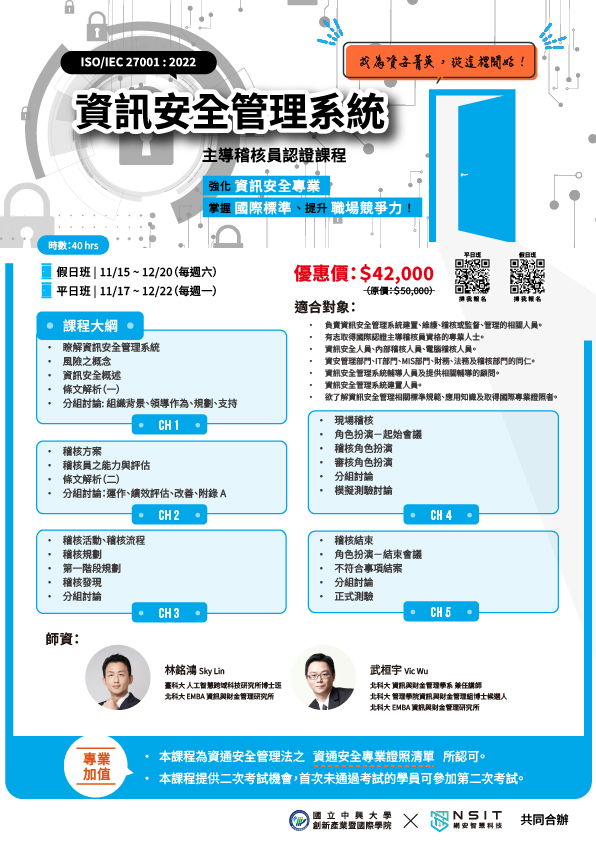 在全球數位化迅速推進的時代,遠端辦公與各種電子設備的使用已成為工作的新常態。然而,伴隨而來的資訊安全威脅如公司內部貴重資料外洩、層出不窮的病毒和駭客攻擊,對企業經營造成巨大的衝擊。應對這些挑戰,ISO 組織於2022 年10 月正式頒佈了最新的ISO/IEC 27001:2022 資訊安全、網路安全及隱私保護標準,該標準適用於各種類型、規模與性質的組織,包括企業、政府機構和非營利組織。行政院資通安全會報亦將此標準作為政府單位的資安要求準則。 我們的課程屬於NSIT 課程系列管理類中的資訊安全管理課程之一,專為想深入了解資訊安全管理系統(ISMS) 的專業人士設計。本課程以ISO/IEC 27001 標準為基礎,介紹資訊安全與資訊安全管理系統的稽核概念及其相關重要議題。內容涵蓋安全政策、風險管理、業務持續運作管理、內部稽核及控制措施等領域。透過本課程,學員將能夠深入理解資訊安全管理系統,認識潛在的資安威脅,並學會如何通過稽核資訊安全管理系統來建立或改善企業所需的資訊安全措施。 此外,本課程依據最新公告的ISMS 標準ISO/IEC 27001:2022 及ISO/IEC 27002:2022,並納入最新公告的資訊安全風險管理國際標準ISO/IEC 27005:2022,確保學員獲得最新、最完整的資訊安全管理知識。參加本課程後,學員將具備管理和稽核資訊安全管理系統的能力,為企業在數位化浪潮中提供堅實的安全保障。