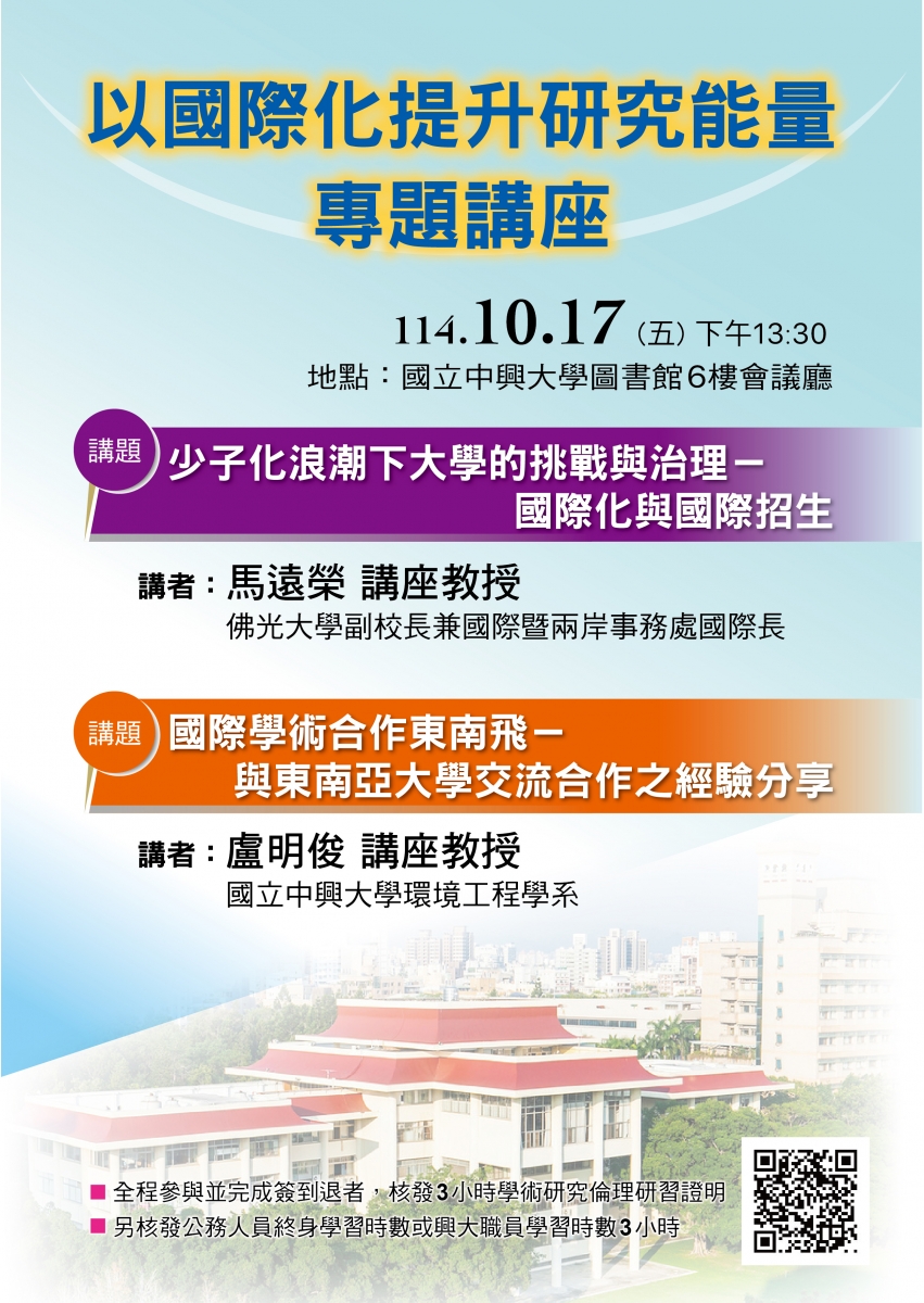 【活動Activity】本校114年10月17日(五)舉辦「以國際化提升研究能量專題講座」,歡迎報名參加。NCHU will hold " Special Lecture: Enhancing Research Capacity through Internationalization " on October 17, 2025 (Friday), welcome to sign up.