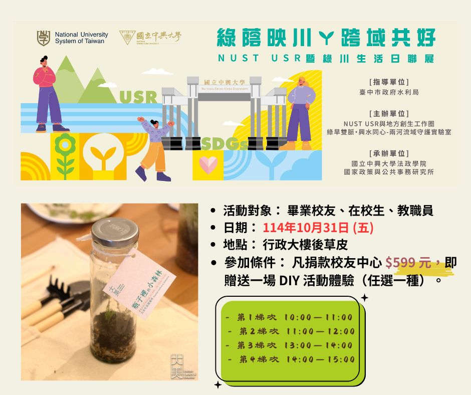 參加條件: 凡捐款校友中心 $599 元,即贈送一場 DIY 活動體驗(任選一梯次)。