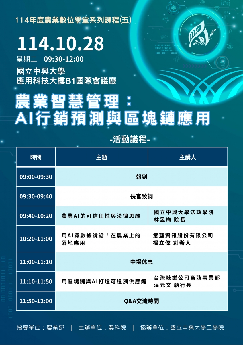※※敬邀參加114年10月28日(二)09:30-12:00「114年農業數位學堂系列課程(五)~農業智慧管理:AI 行銷預測與區塊鏈應用」※※