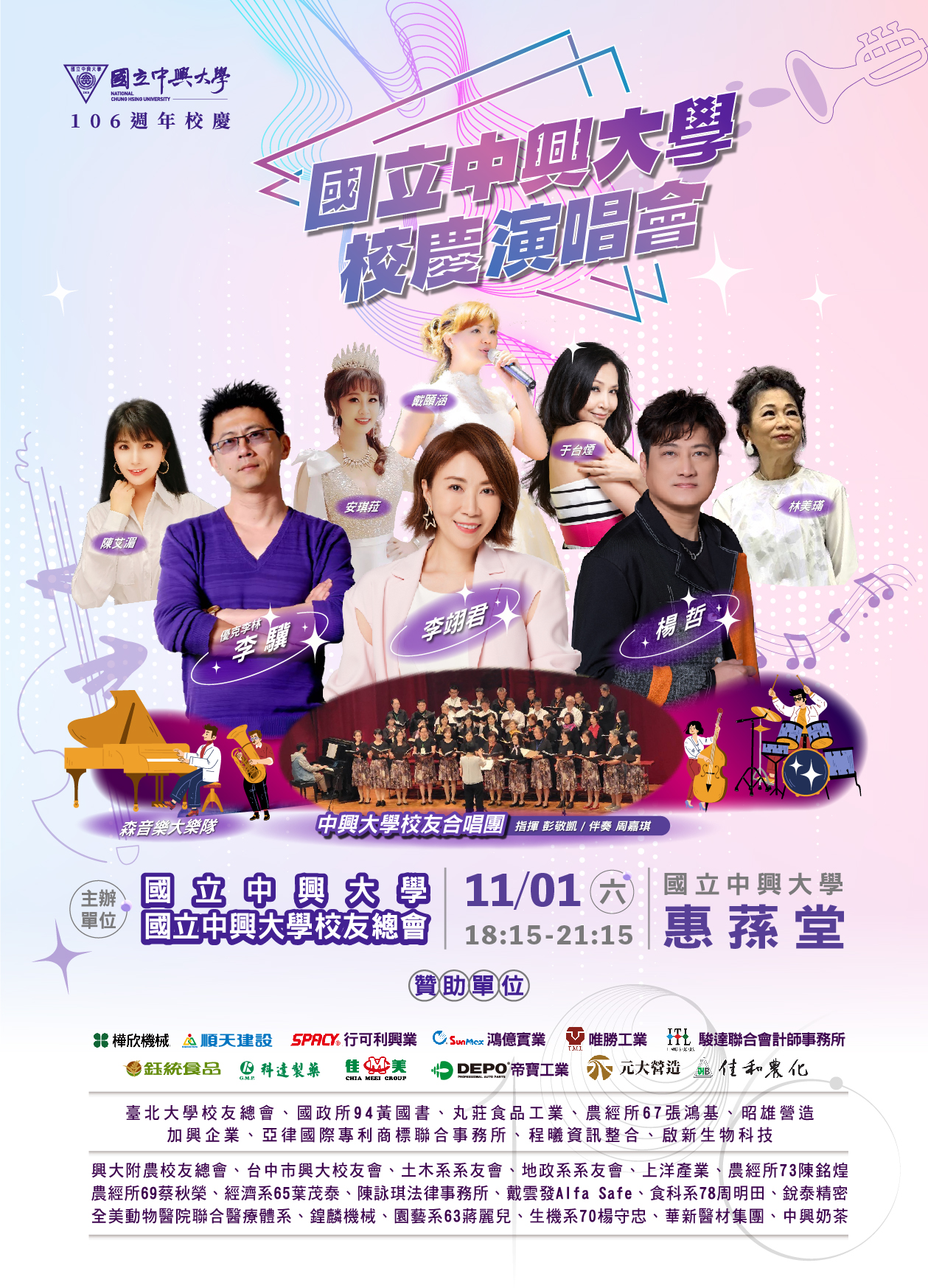 為共同歡慶106週年校慶,由本校與校友總會共同舉辦校慶演唱會,謹訂於 114年11月1日 (星期六) 18:15-21:15 於惠蓀堂辦理(海報如附檔)。