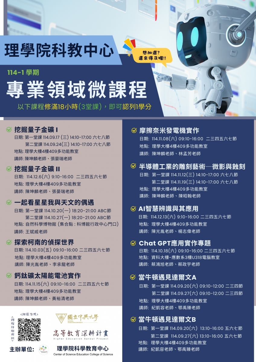 課程資訊|本課程屬「專業領域微課程」,共6小時。修滿18小時(3門課)可認列1學分。