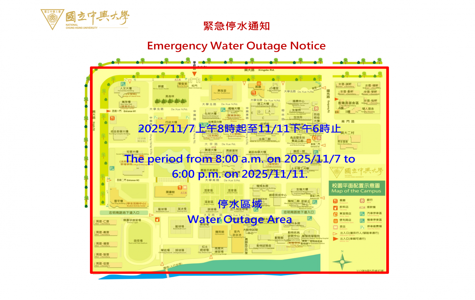 本校二號水塔因地下水管路補水異常,已緊急招商進行抽水馬達更新作業,屆時將影響本校各建物暫停地下水之供應,停水期間如各大樓設有自來水與地下水補水切換系統請先開啟使用,避免抽水馬達空轉造成損害,造成本校教職員生不便之處,敬請見諒。 Due to abnormal water supply in the No. 2 water tower’s underground system, urgent repairs are being made to replace the water pump motor. During this period, the underground water supply to all campus buildings will be suspended. Please activate the tap water system if available to prevent damage to the pump. We apologize for the inconvenience and appreciate your understanding. |