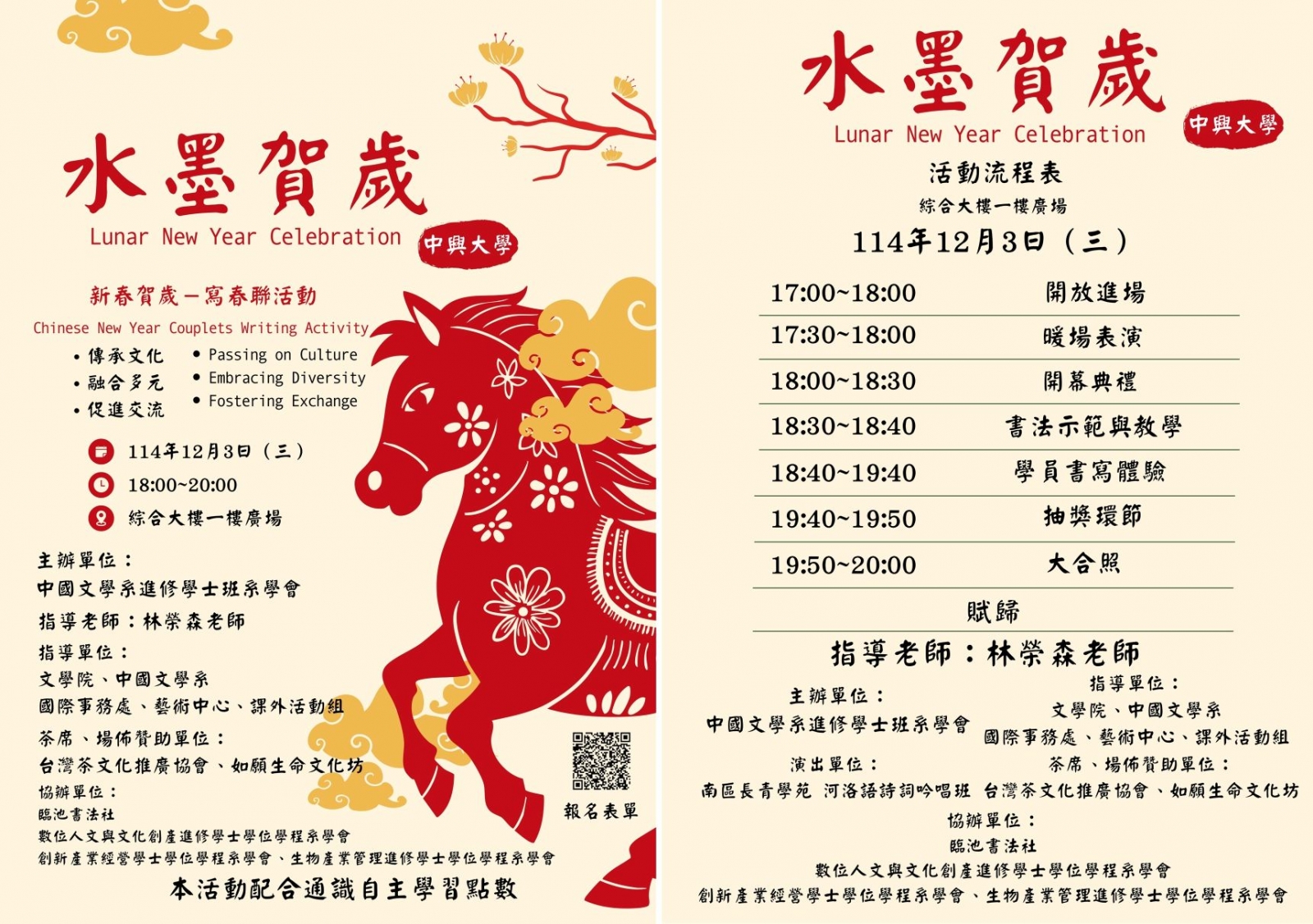 ♦ 協辦:臨池書法社、數位人文與文化創產進修學士學位學程系學會、創新產業經營學士學位學程系學會、生物產業管理進修學士學位學程系學會