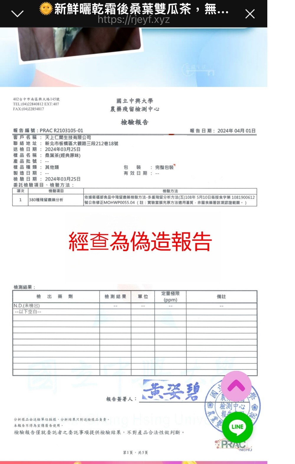 二、經查,上開網路上所出示之檢測報告原為110 年4 月份,興大農藥殘留檢測中心針對該樣品桑葉茶所做之檢測。報告內容經不法變造,變造送檢日期、檢驗日期及報告日期作為產品宣傳,以誤導民眾,並致生損害本校農藥殘留檢測中心名譽,本校將保留法律追訴之權利。