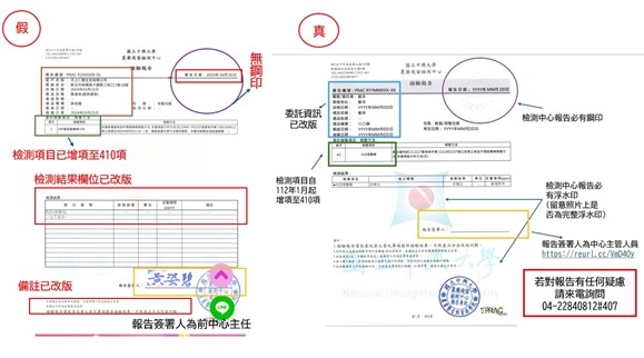 三、興大農藥殘留檢測中心提醒消費者於網站上查閱產品資訊時,留意辨別農業殘留檢驗報告真實性,消費者若有疑慮,可要求業者出示正本檢驗報告,並留意報告文字上下方線條是否塗改或不連續。