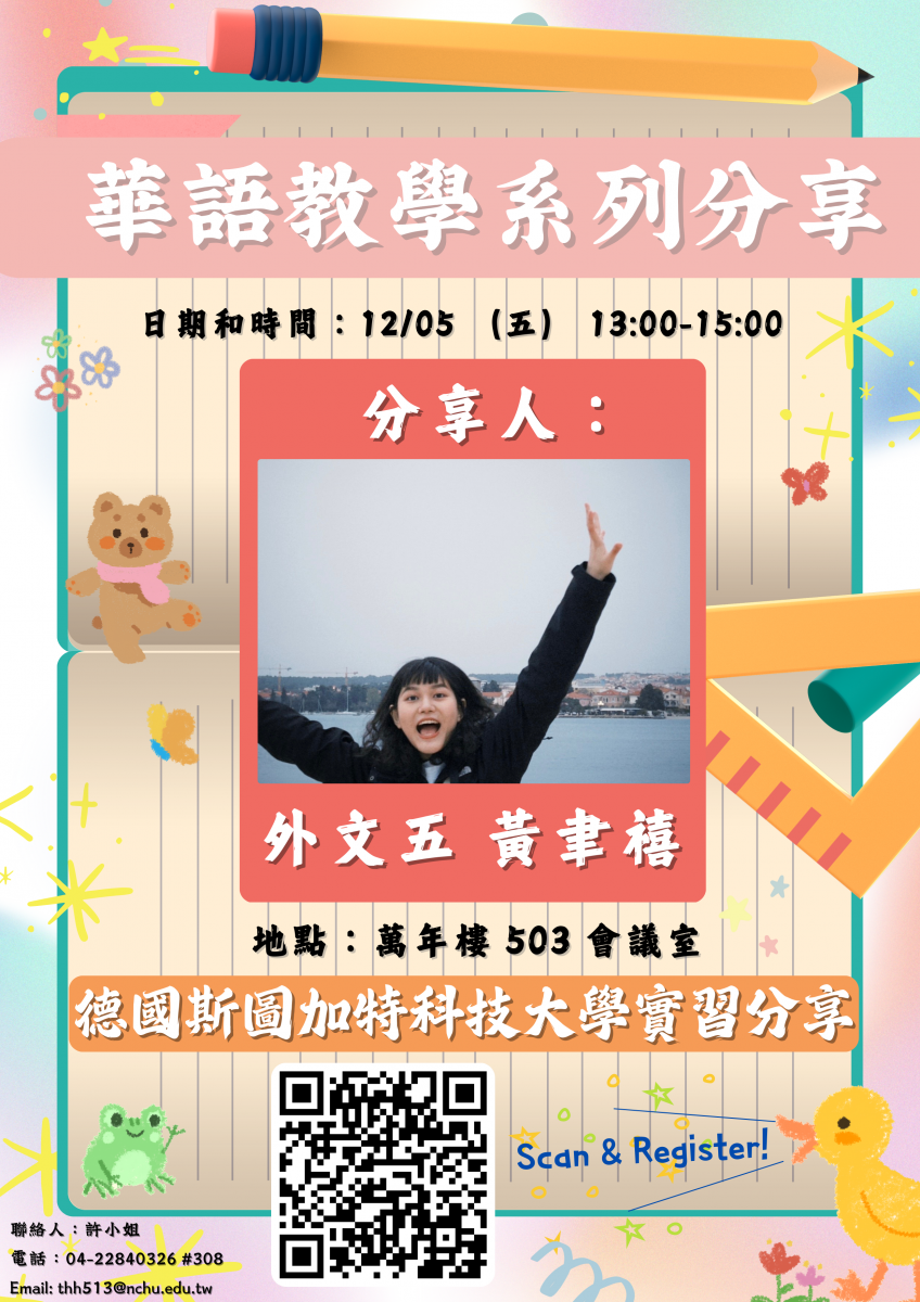 【華語教學系列分享】德國司徒加特科技大學實習分享 (延期至12/5)