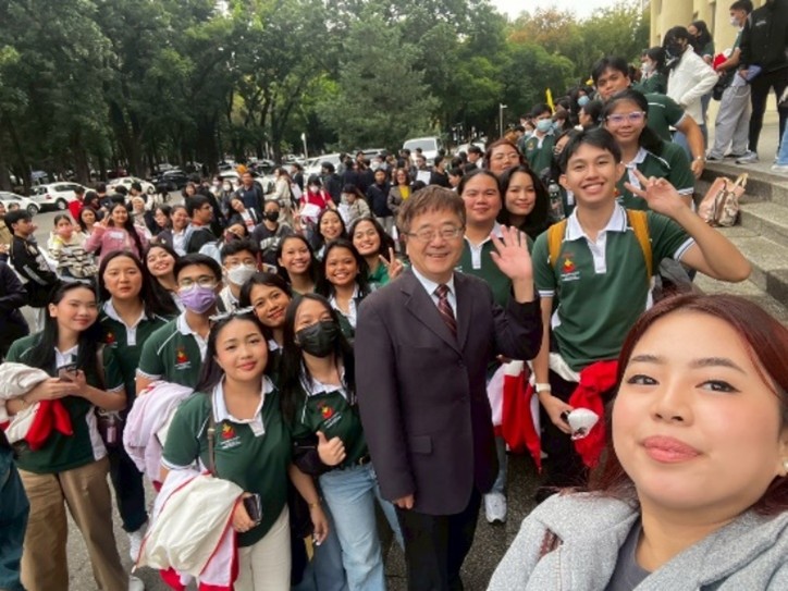接著由招生大使與在校菲律賓學生帶領訪團進行校園導覽,介紹中興湖、圖書館、運動場等重要地標,使學生能感受中興大學的校園氛圍及生活環境。行程最後,最令學生驚喜的是,詹富智校長親自前來向訪團致意並合影留念,表達對瑪布亞大學師生的歡迎,為此次友好且具深遠意義的參訪活動畫下溫馨句點。