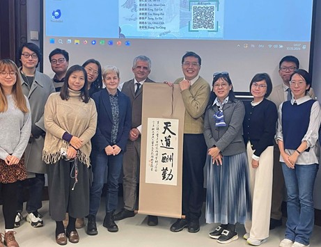首先,中文系團隊於11月14日至17日赴德國萊比錫大學東亞所進行學術交流活動,受到所長Prof. Dr. Philip Clart(柯若樸)教授的歡迎,並於11月15日舉辦雙邊研討會「清代和民國的文學與社會(Literatur und Gesellschaft während der Qing-Dynastie und der Republik China)」,一整天會議共有四場次,分別為「清代宗教文學中的身體與社會」、「近代文學與社會的互動」、「近代知識分子與文化轉繹:萊比錫傑出校友蔡元培、蕭友梅、林語堂」、「近代文學與文化的現代性風景」,共十二位教授發表研究成果。德方四位,包括Prof. Dr. Philip Clart(柯若樸)、Prof. Dr. Elisabeth Kaske(白莎)、Dr. Joerg Henning Huesemann(徐約和)與Dr. Adrian Krawczyk(康阿迪)四位教授。我方八位,除了前往德國交流的五位教授外,康凱淋教授線上發表,另有兩位友校教授參與,達到跨校交流的目標。此外,林榮森教授以書法題獻萊比錫大學東亞所,獲得熱烈的迴響。會後陸續參訪萊比錫大學檔案館、萊比錫音樂學院與附近的耶拿大學圖書館,充分瞭解蔡元培、蕭友梅與林語堂在德國的足跡與相關文獻,獲益匪淺。