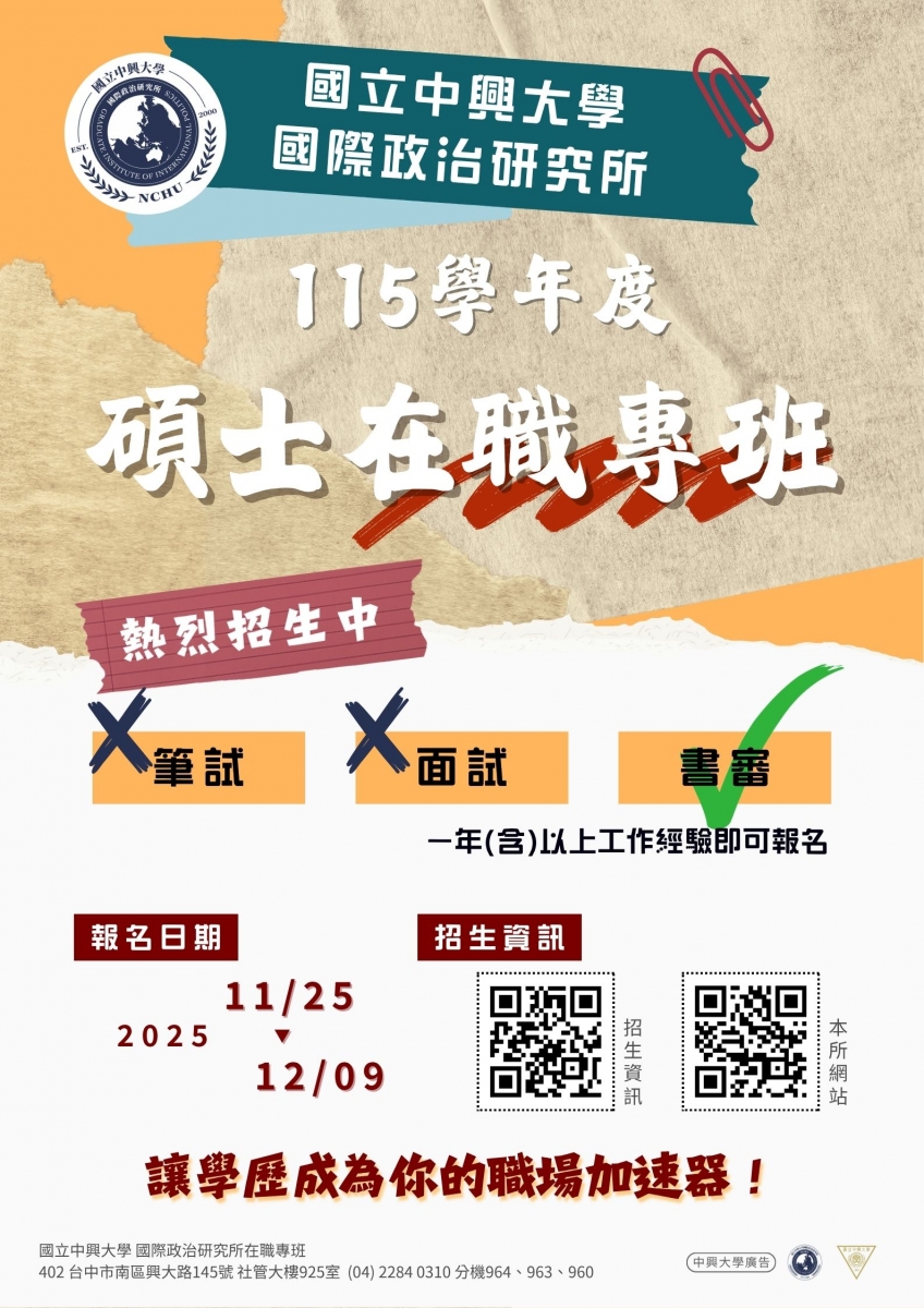 國際政治研究所碩士在職專班115學年度 誠摯邀請您報名!