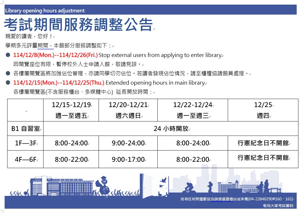 114學年第一學期期末考多元評量期間,本館部分服務調整如下: