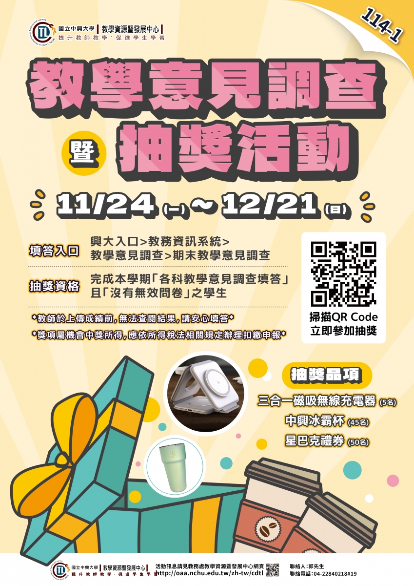【填問卷,抽好禮】114-1期末教學意見調查暨抽獎活動!