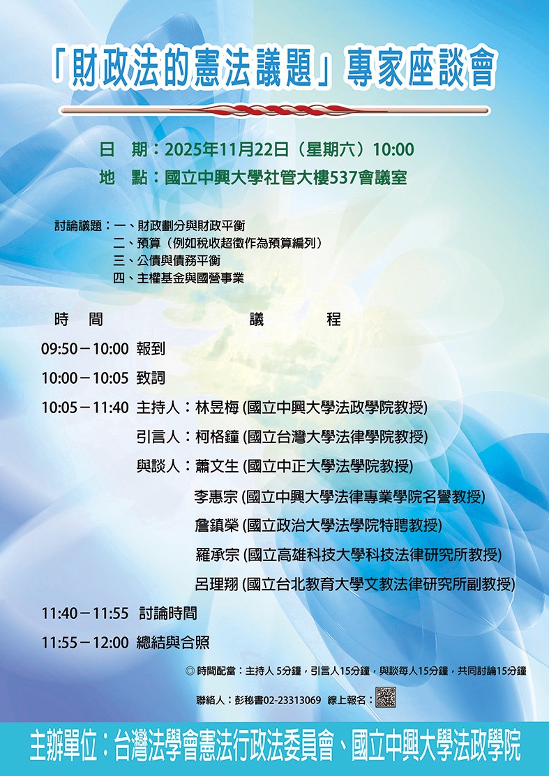 台灣法學會憲法行政法委員會與國立中興大學法政學院於2025年11月22日共同舉辦「財政法的憲法議題」專家座談會,邀請多位公法學者,就台灣當前財政法制面臨的重大爭議進行深入探討。本次會議由中興大學法政學院林昱梅院長主持,引言人為台灣大學柯格鐘教授,與談人包括中正大學蕭文生教授、中興大學李惠宗名譽教授、政治大學詹鎮榮特聘教授、高雄科技大學羅承宗教授及臺北教育大學呂理翔副教授。