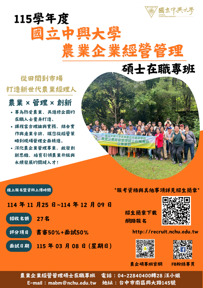 【碩士在職專班】115學年度 ★農業企業經營管理碩士在職專班★ 現正招生中!