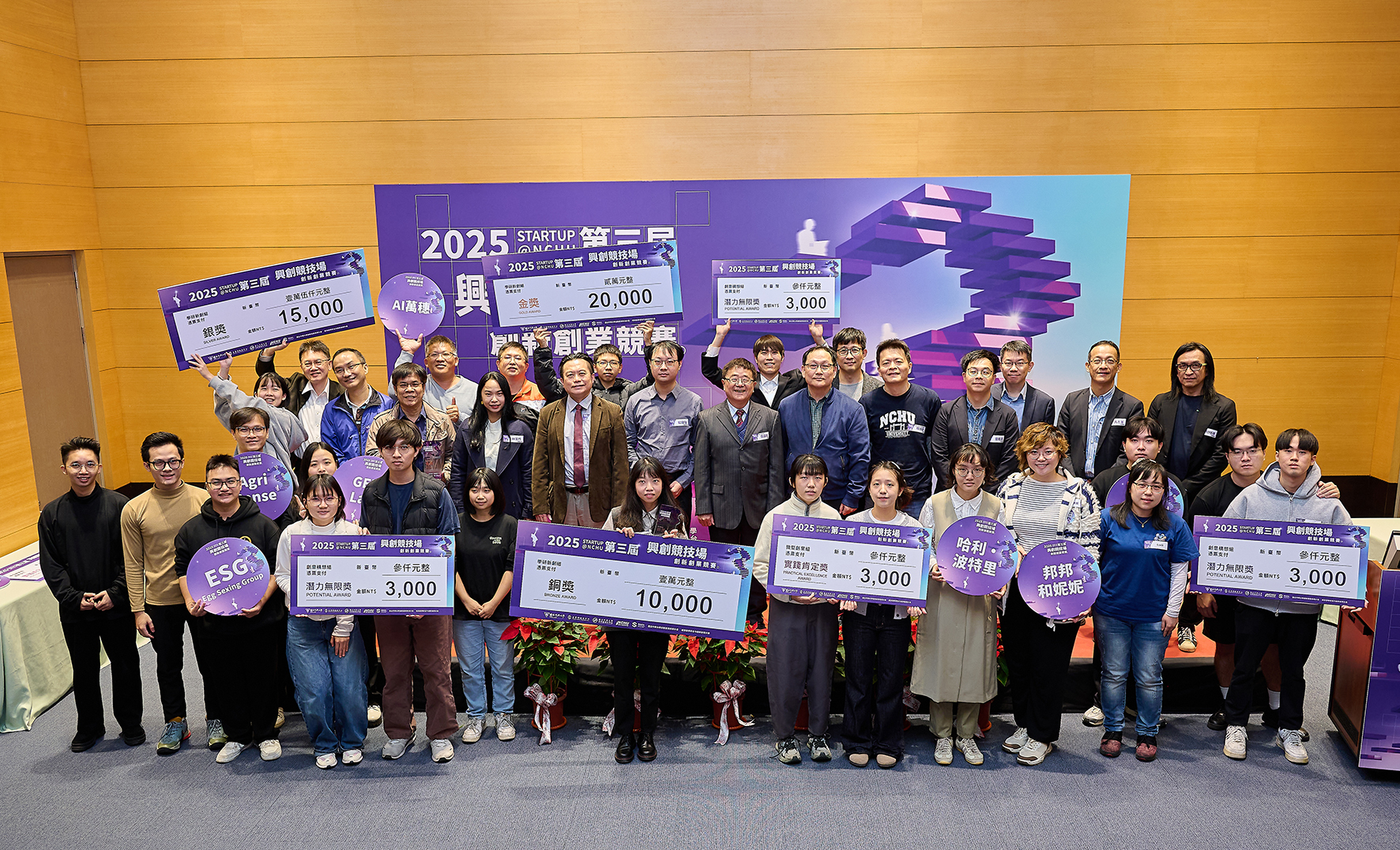 頒獎典禮在詹富智校長親揭學研新創組「銅、銀、金」獲獎團隊時掀起最高潮,最終所有獲獎團隊與評審委員們及與會師長開心大合照,2025〈第三屆興創競技場〉創新創業競賽劃下圓滿句點。以下整理完整得獎名單: