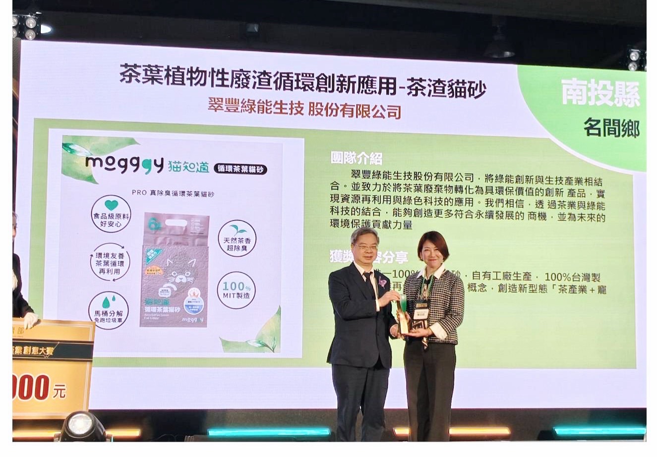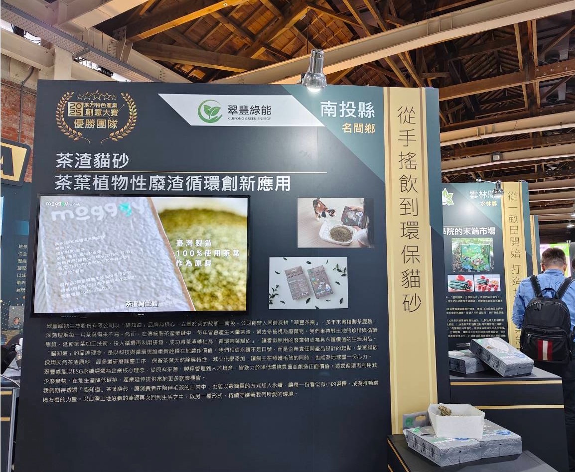 本次獲獎成果以南投名間為主要實作場域。名間為臺灣商用茶的重要產區之一,長期面臨茶飲料生產後大量茶葉渣處理不易的產業課題。陳羽鉉同學結合循環經濟理論與實務製程,將原本被視為高含水率、需額外處理的茶葉渣,透過製程與配方設計,轉製為具備高效除臭力之永續環保性貓砂產品。該產品主要以茶葉渣為原料,搭配少量具凝結效果的植物性材料,具備可自然分解及可沖馬桶處理等環境友善特性,為農業剩餘物高值化提供具體示範。