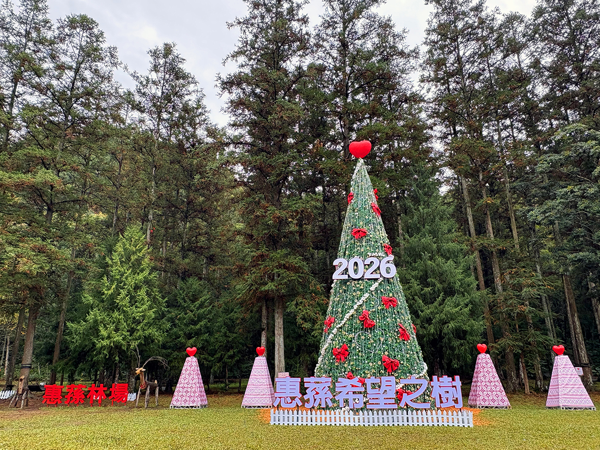 在燈飾展期內,林場也將同步進行行銷活動,民眾凡完成社群互動,即可獲贈原生苗木乙株及惠蓀住宿優惠券乙張,在獲得祝福小樹苗的同時,也能享受林場的住宿優惠,共同推廣森林永續的理念。惠蓀林場誠摯邀請社會各界與廣大遊客,一同前來感受這份愛與希望的能量,在光影閃爍中,為新的一年許下心想事成的美好盼望。