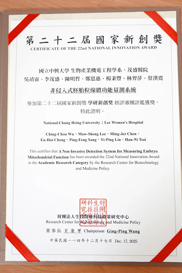 台灣生殖醫療技術再創里程碑。茂盛醫院與國立中興大學共同研發的「非侵入式胚胎粒線體功能量測系統」,以量測胚胎呼吸狀況作為評估胚胎品質的科學依據,為全球首創的胚胎粒線體功能檢測平台,榮獲第22屆國家新創獎肯定。此技術被視為下一世代精準生殖醫學的重要關鍵,未來可望全面提升試管嬰兒療程成功率,並具備高度產業化與國際輸出潛力。