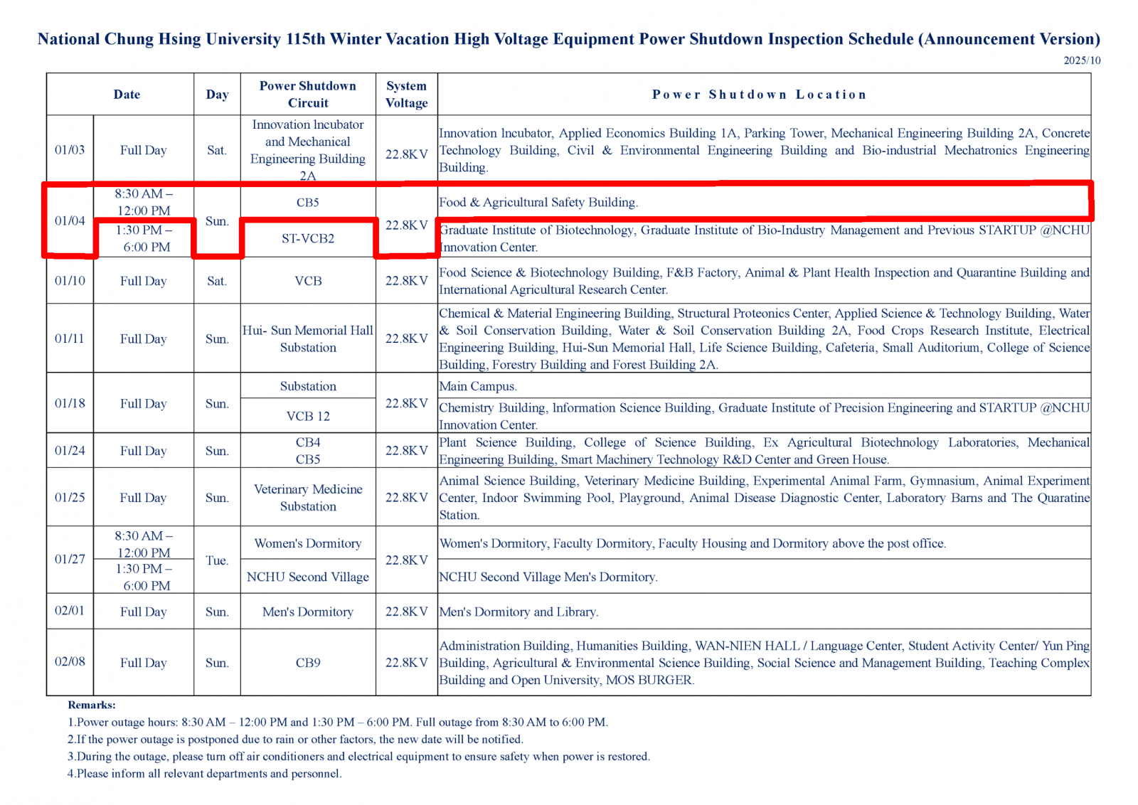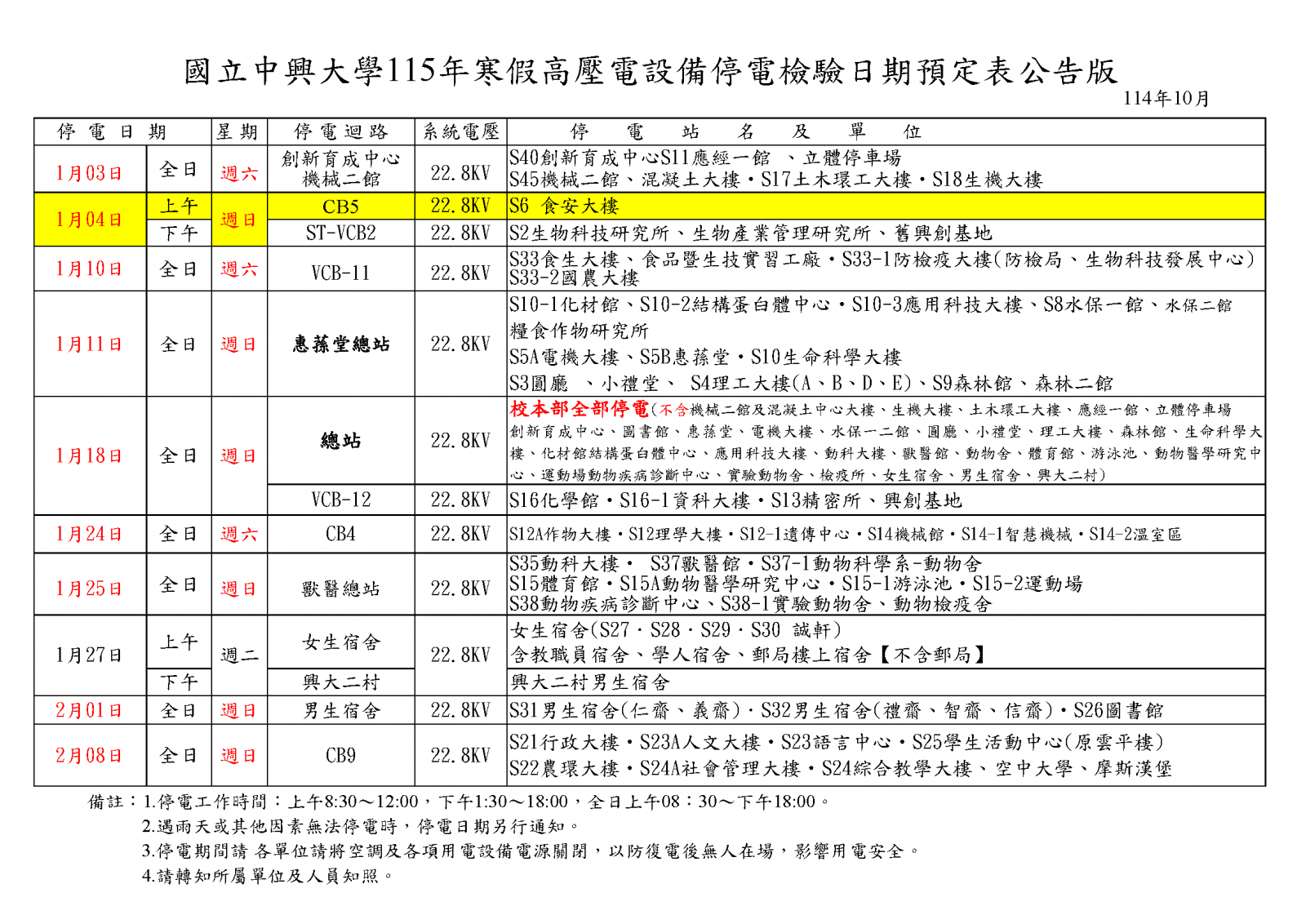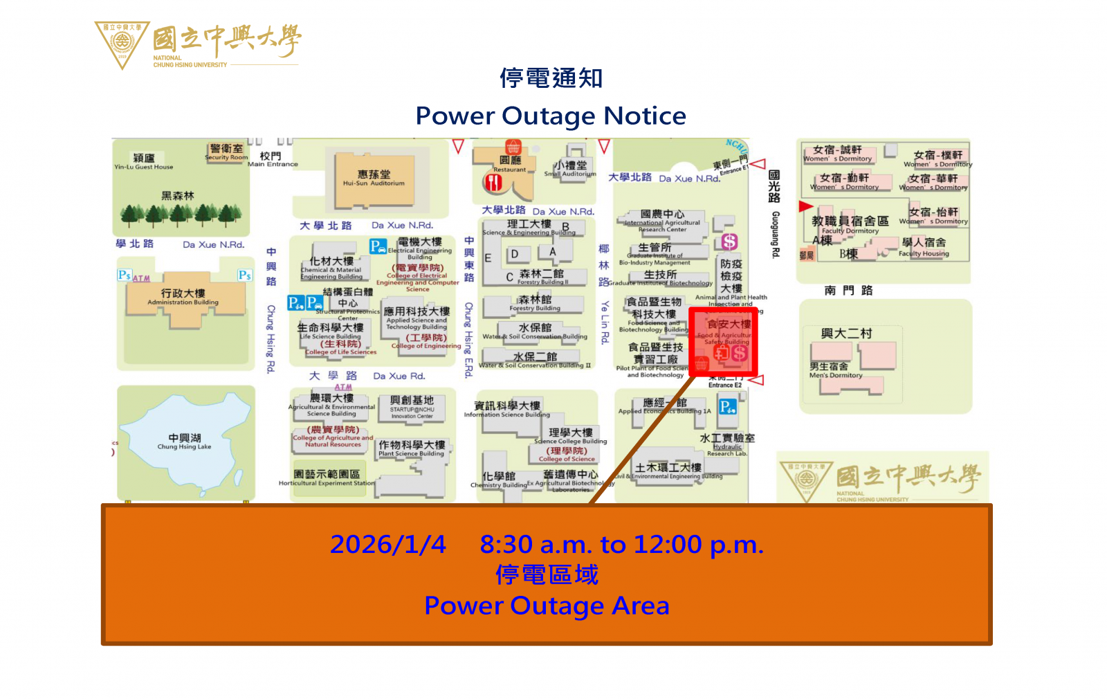 【營繕組停電公告-115年1月4日(日) [上午]-CB5迴路(食安大樓) 高壓設備停電檢驗通知】Power Outage Notice - 1/4/2026 (AM)
