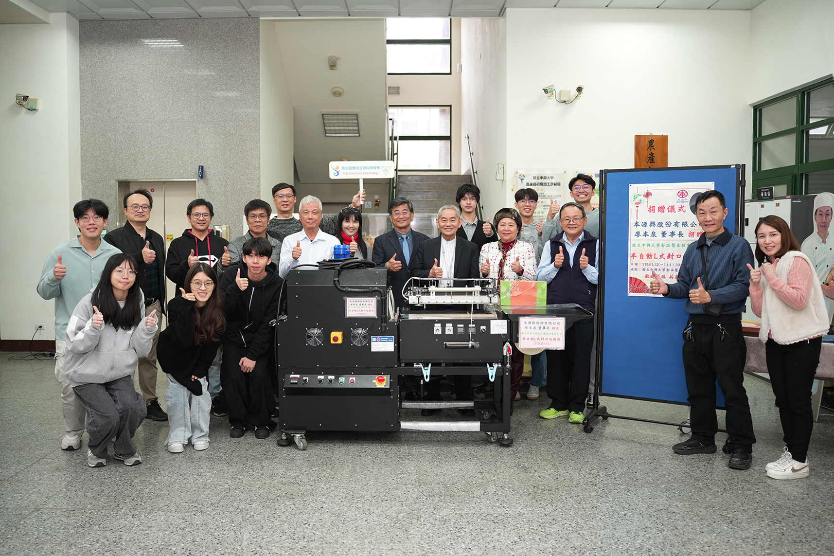 中興大學食品暨生技實習工廠於1月12日舉行捐贈儀式,本源興股份有限公司廖本泉董事長熱心回饋母系,慷慨捐贈半自動 L 式封口包裝機一部,協助提升食品暨應用生物科技學系食品加工與包裝相關課程之教學與實習能量,展現企業回饋教育、關懷人才培育的精神。