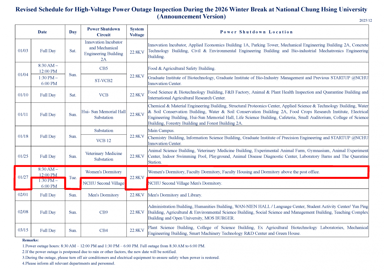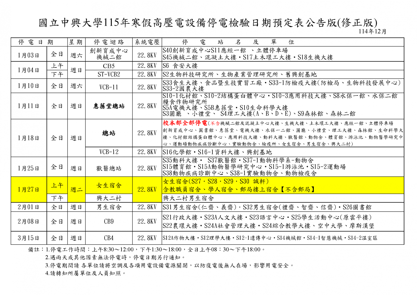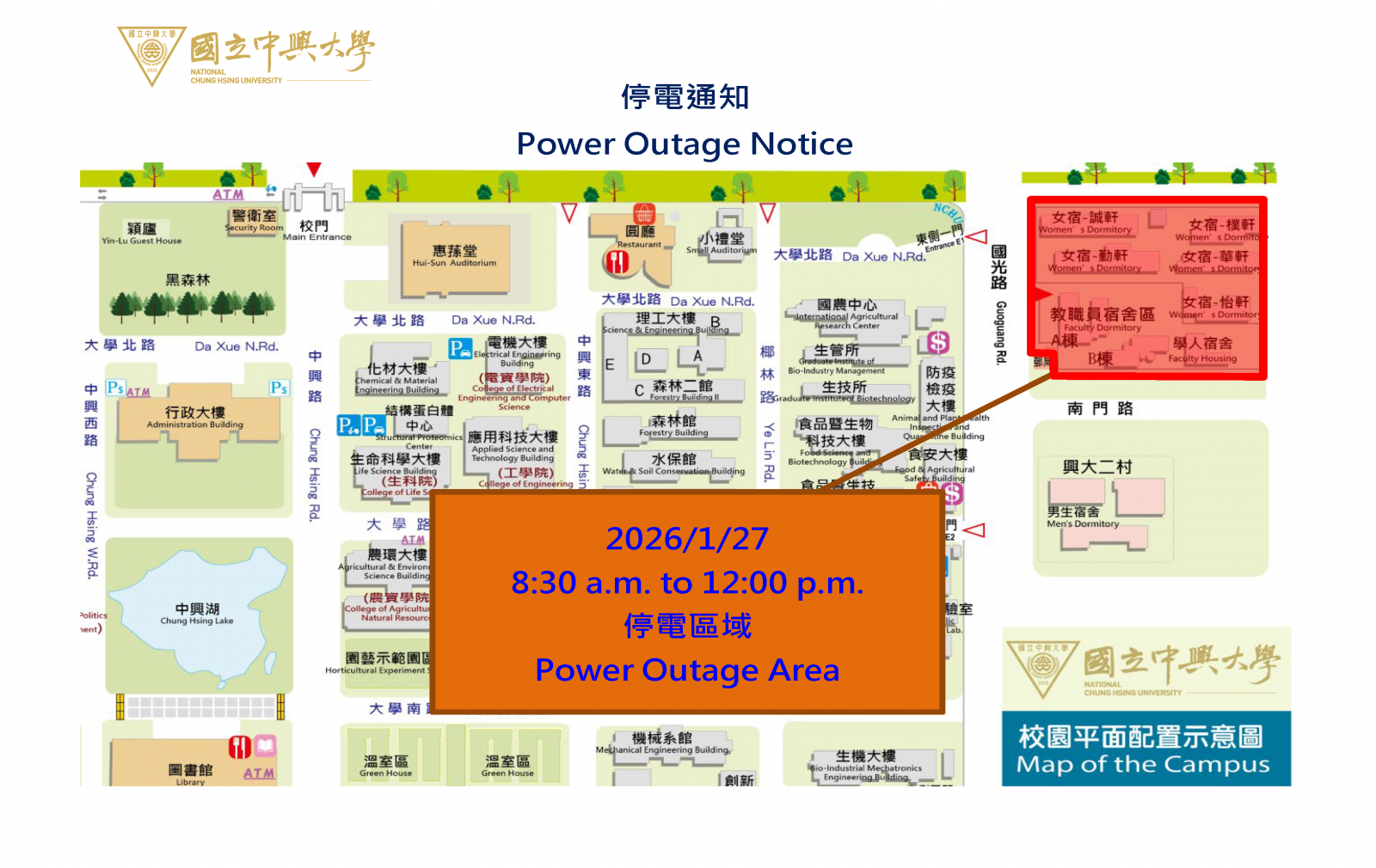 【營繕組停電公告-115年1月27日(二) [上午]- 女生宿舍迴路(女生宿舍區、敎職員宿舍、學人宿舍區、郵局樓上宿舍) 高壓設備停電檢驗通知】Power Outage Notice 1/27, 2026 (Morning)