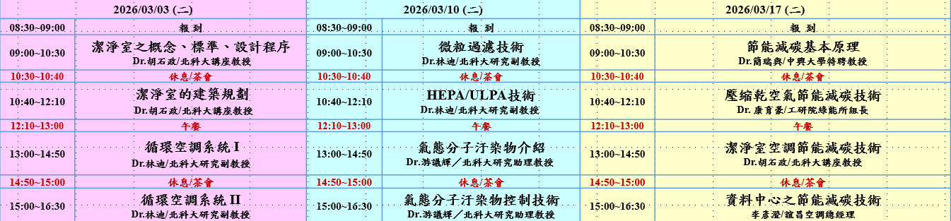 由於業界需求持續增加、學校技術人才供應不足,造成各高科技廠/承商面臨技術人才短缺的窘境。其次,面對日益競爭的產業環境,唯有不斷加強本身的知識技能才能立於不敗之地。因應企業節能減碳及ESG(ESG 是一個衡量企業永續發展表現的新型態指標,其縮寫代表環境保護(Environmental)、社會責任(Social)、公司治理(Governance) 這三大面向) 要求, 我們提供新的潔淨室設計研習方案,強調新的潔淨室設計概念及設計方法。北科大潔淨技術中心與興大機械系智慧機械技術研發中心,本著服務社會及提昇潔淨技術的宗旨,持續不斷引進新知、培養更多廠務與潔淨室技術學生、也同時提供業界短期進修機會,讓已在職者提高技術水平。本研習提供業主(甲方)、承商(乙方)、運轉者、設計者所需之學理及實務知識,提供適切而即時的短期研習,並網羅來自業界及學術單位各領域專家教授廠務與潔淨室技術等相關研習,期能對台灣科技產業之基礎貢獻一己之力。