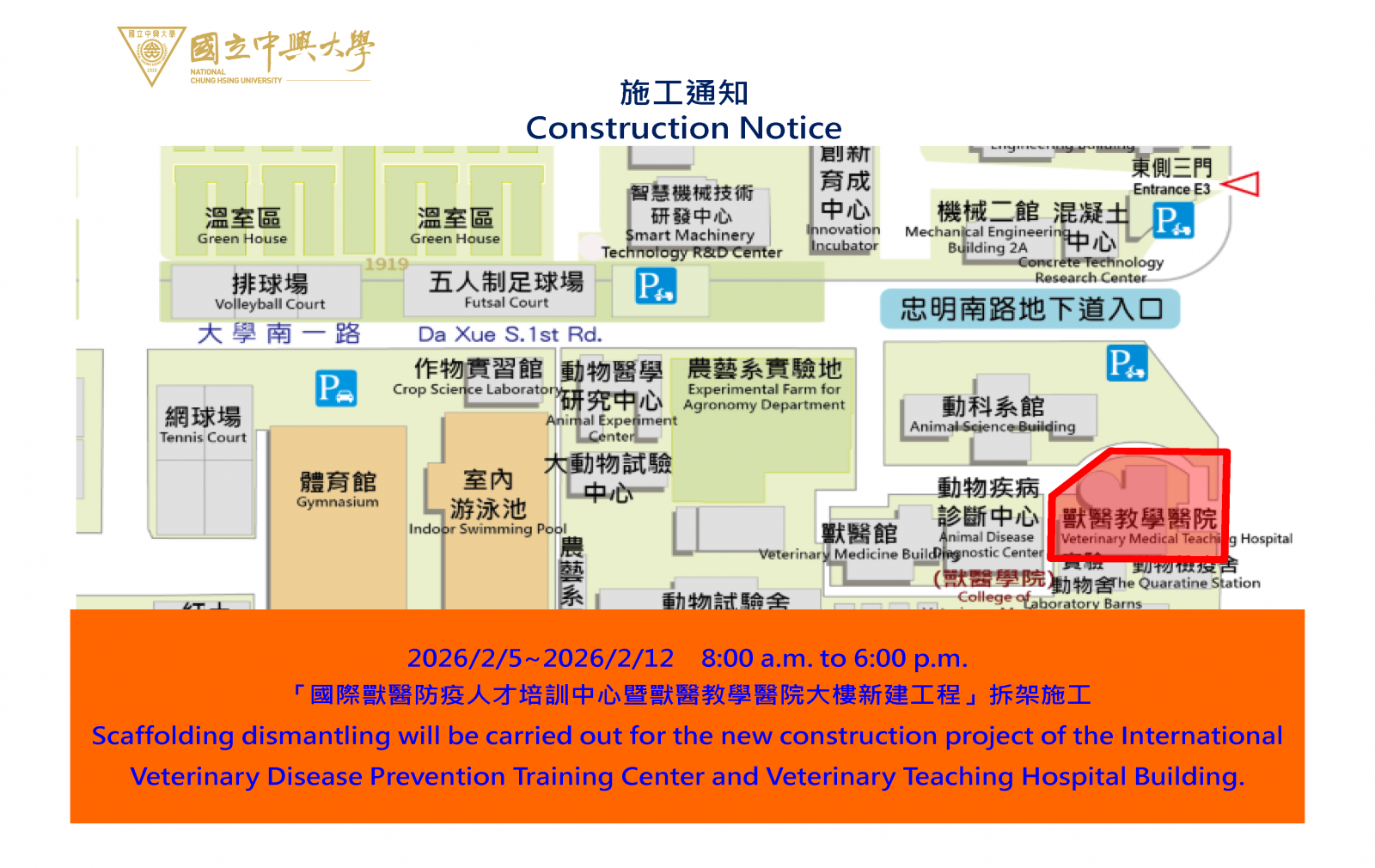 「國際獸醫防疫人才培訓中心暨獸醫教學醫院大樓新建工程」拆架施工,敬請本校師生及來賓配合現場公告勿於施工區域、周邊停車場及人行道停放汽機(踏)車,並配合現場交通管制,施工期間因部分工項產生噪音,敬請包涵。如遇不可抗拒因素(例如:颱風、大雨等),施工日期將順延。 Scaffolding dismantling will be carried out for the new construction project of the International Veterinary Disease Prevention Training Center and Veterinary Teaching Hospital Building. All faculty, students, and visitors are requested to follow on-site notices, refrain from parking in the construction area, nearby parking lots, and sidewalks, and comply with traffic control arrangements. Noise may occur during the construction period; your understanding is appreciated. Work will be rescheduled in the event of a typhoon or heavy rain. |