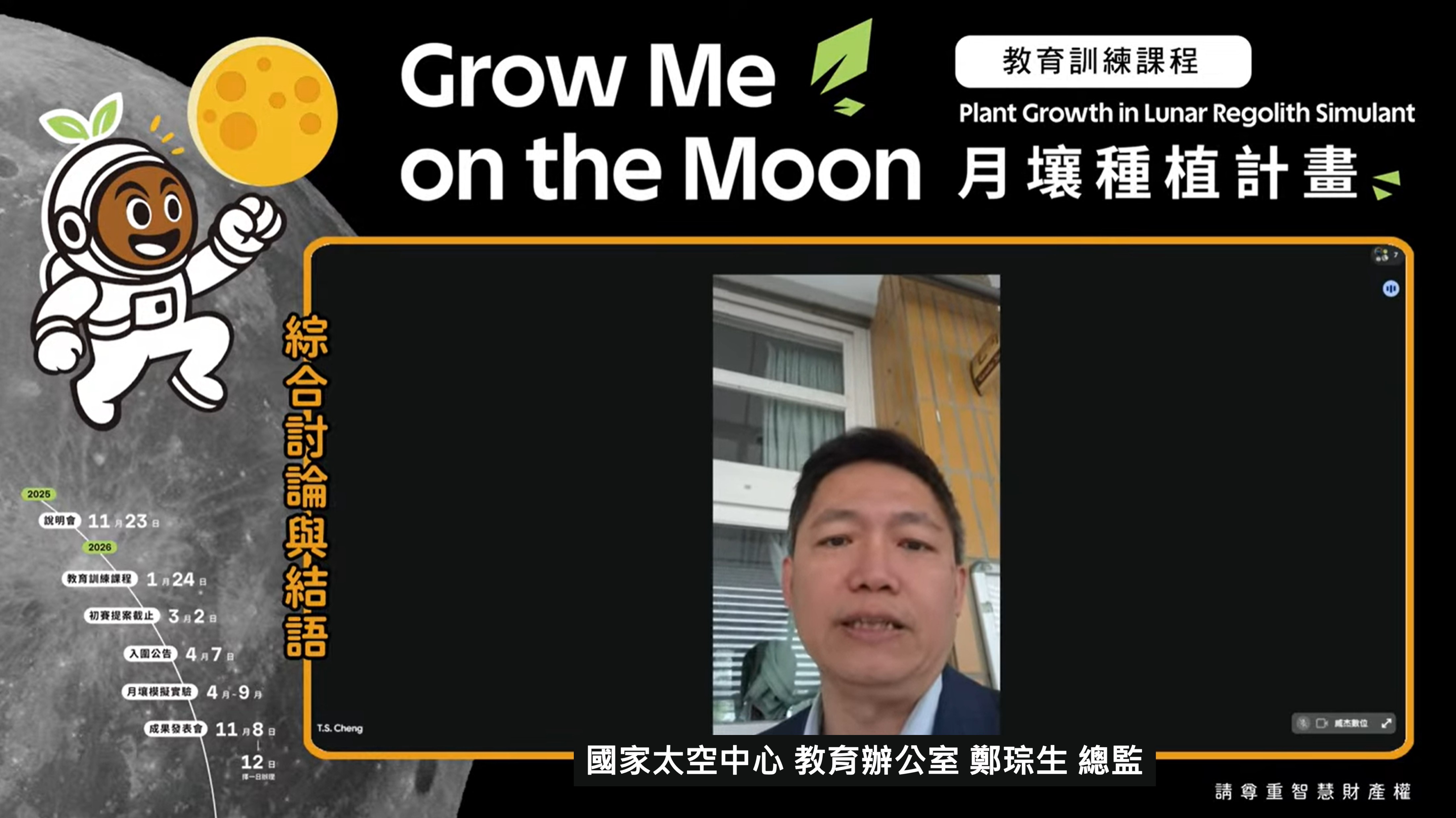 中興大學農業推廣中心(以下簡稱農推中心)承辦由國家太空中心(TASA)主辦之「Grow Me on the Moon — 月壤種植計畫」,從去年的線上說明會到此次線上教育訓練課程辦理,為的就是讓有興趣參加月壤模擬種植實驗提案的參賽者們提供基礎知識以及實作指引。課程由本校園藝學系張嵐雁老師主持,協助講師與學員交流互動,提升學習成效。當天課程亦全程收錄於GMOM YouTube 頻道及本活動官網,供學員複習以及觸及更多民眾上網觀看,增進對太空農業的了解。