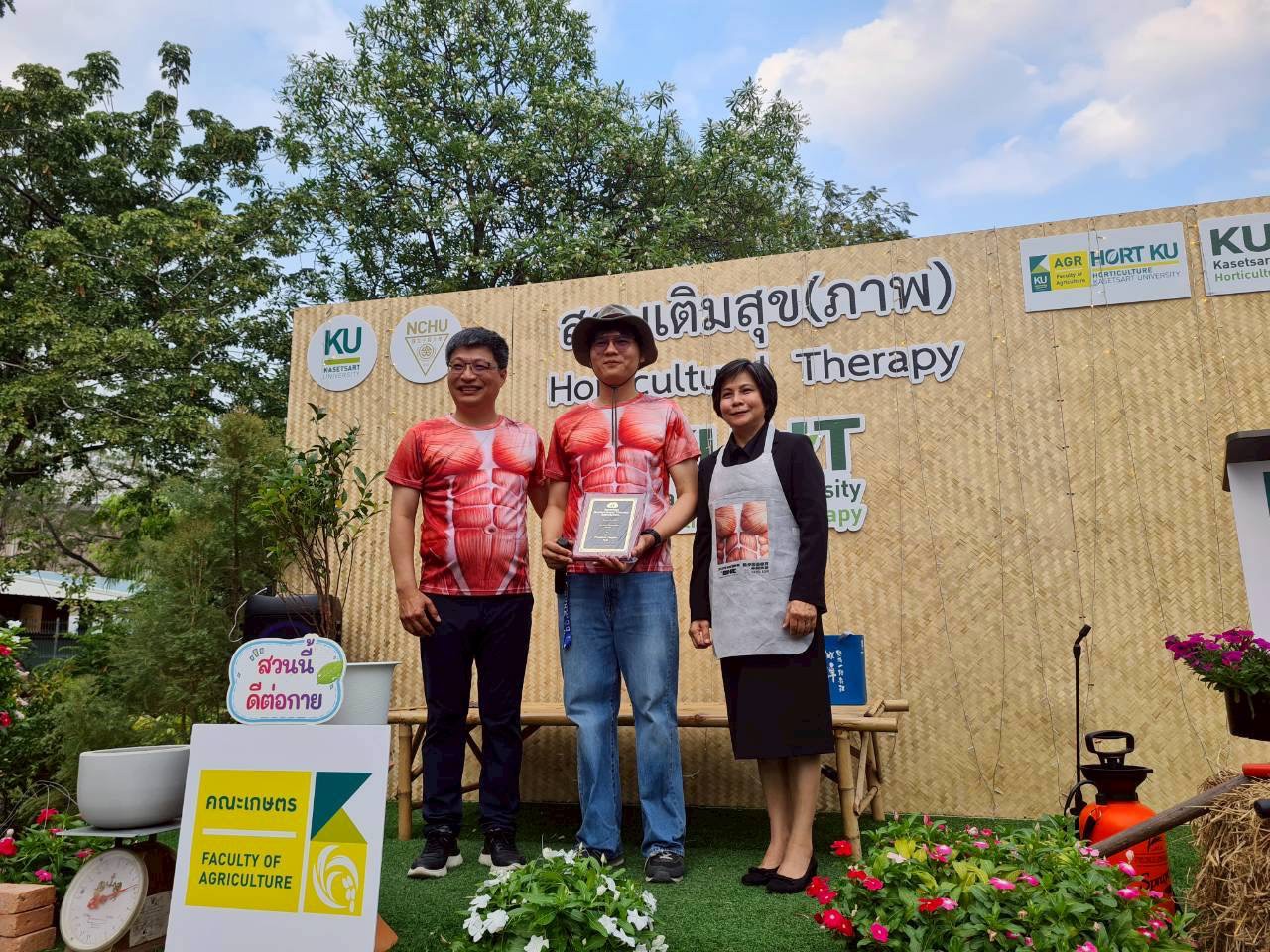 2026年1月30日至2月7日舉辦的Kaset Fair,是泰國農業界的年度大事,在超過2,000個展攤中,中興大學與泰國農大農學院共同營造的「肌少園藝療育展區」成為焦點之一。泰國農大農學院院長Dr. Patchareeya Boonkorkaew指出園藝療育是本院創新推動的核心領域,透過與中興大學團隊的合作,引入肌少症預防的新觀念,不僅落實了園藝與醫學的跨界對話,更為本院師生開拓了全新的研究視野。園藝系主任 Dr. Tanapon Chaisuriyanant 則對興大團隊高度讚賞。他觀察到,由吳振發教授帶領的 6 位碩博士生,親自帶領泰國師生共同營造展區並進行實地解說,成功引發泰國青年學子對園藝健康產業的濃厚興趣,現場講座與互動活動更吸引大批泰國民眾駐足參與。