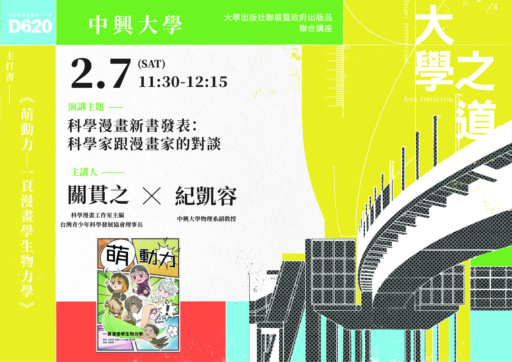 其中,本校今年推出的科普漫畫新書《萌動力:一頁漫畫學生物力學》,嘗試以四格漫畫形式,將動物行為與身體運動背後的物理與生物力學原理,轉化為一頁即可理解的圖像敘事,展現學術知識親近化、生活化的可能。為延伸新書內容,本中心將於2月7日(六)11:30–12:15,在臺北國際書展世貿一館D620大學出版社聯展展位,舉辦科學漫畫新書發表講座。活動邀請中興大學物理學系紀凱容老師與科學漫畫工作室主編關貫之對談,帶領讀者直擊科學漫畫的誕生過程。