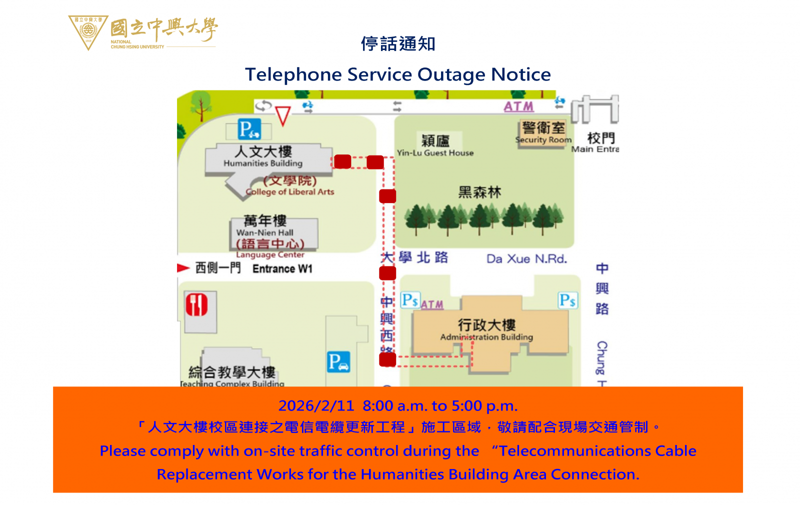 【營繕組停話公告-115年2月11日(三)人文大樓校區連接電信電纜更新工程施工通知】Telephone Service Outage Notice 2/11, 2026