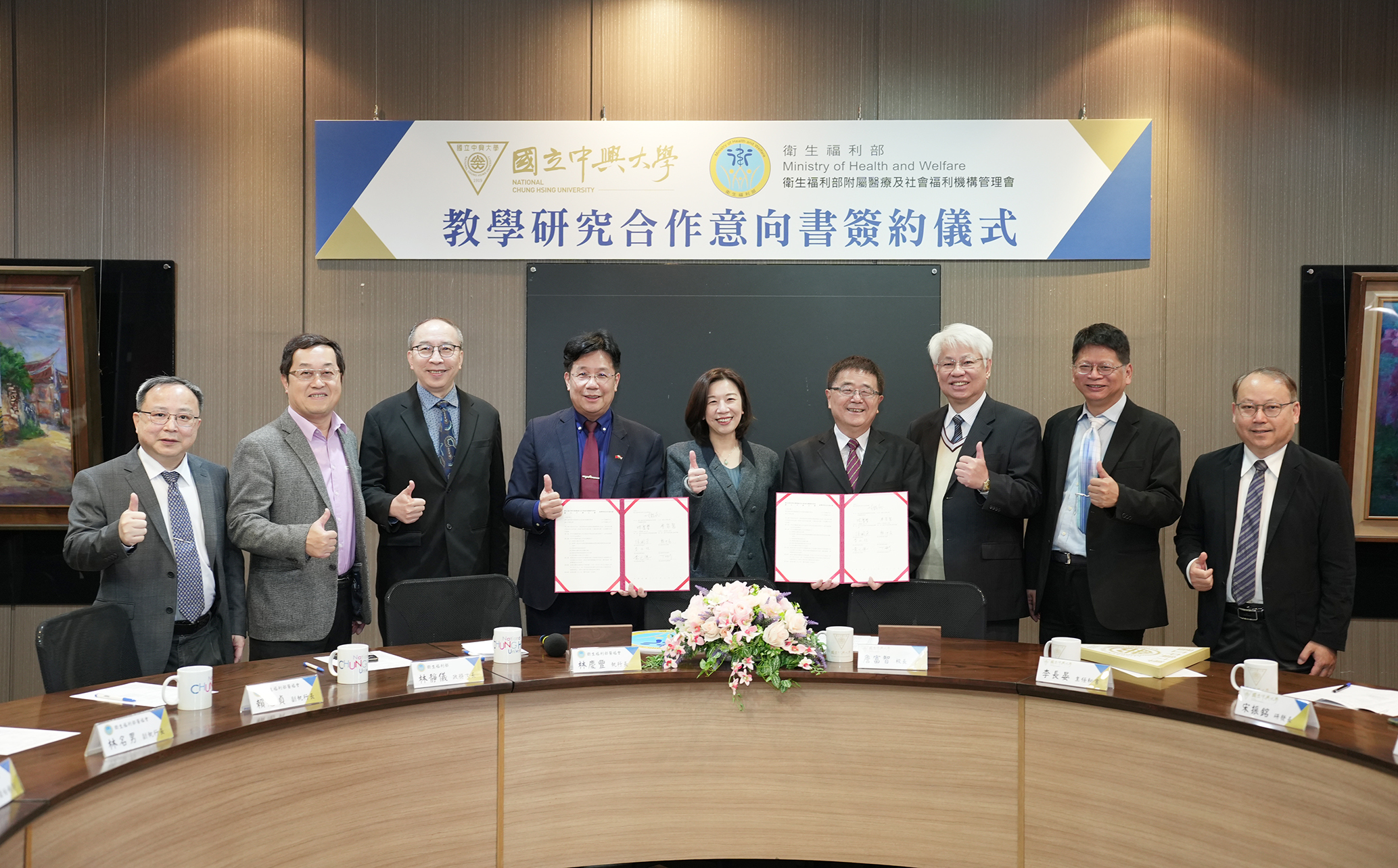 國立中興大學與衛生福利部附屬醫療及社會福利機構管理會(衛福部醫福會)於2月12日舉辦合作協議書簽約儀式,正式建立跨機構合作關係。簽約儀式由衛福部政務次長林靜儀擔任見證人,中興大學詹富智校長與衛福部醫福會林慶豐執行長共同簽署,雙方攜手推動醫療、教育與學術研究之深度合作。
