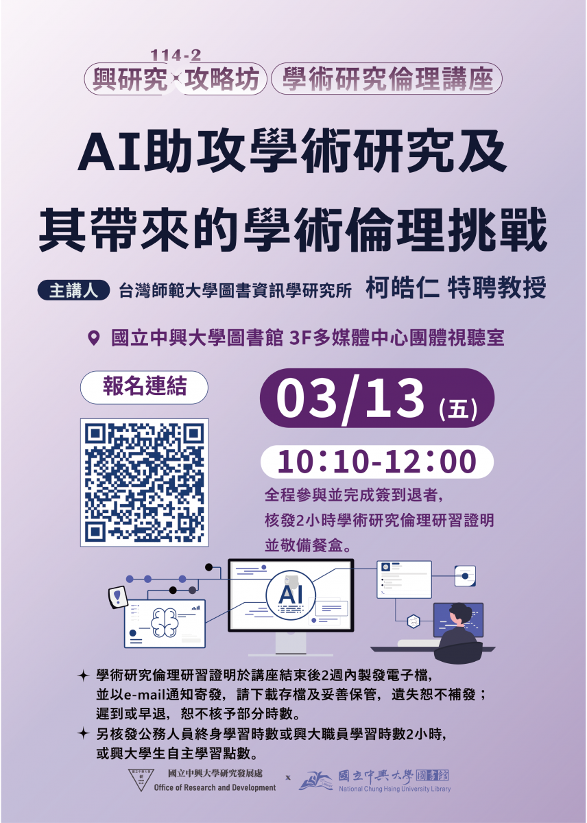 【活動Activity】本校於115年3月13及20日舉辦「學術研究倫理講座」,歡迎報名參加。NCHU to hold two Sessions of “Academic Research Ethics Lectures” on March 13 & 20, 2026.