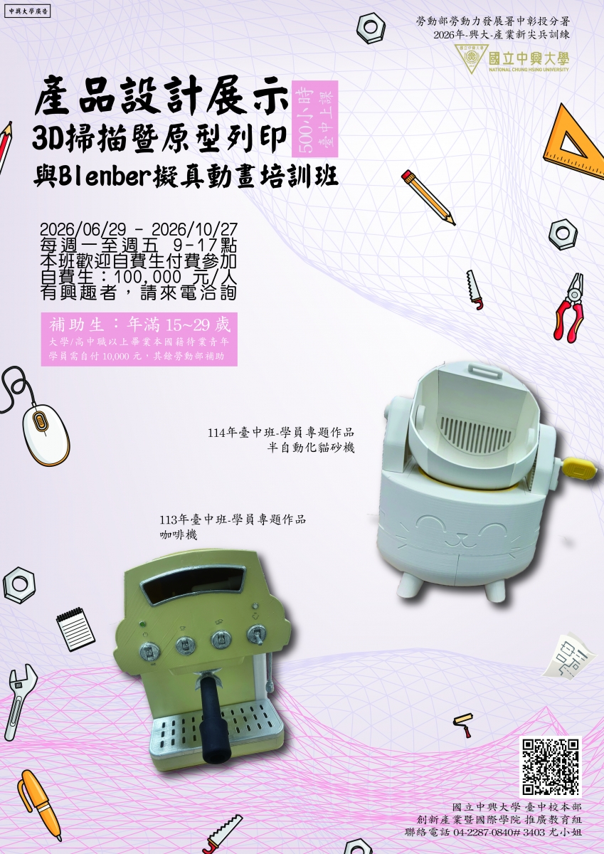 | 產品設計展示-3D掃描暨原型列印與Blenber擬真動畫培訓班 | 06/29至10/27 |