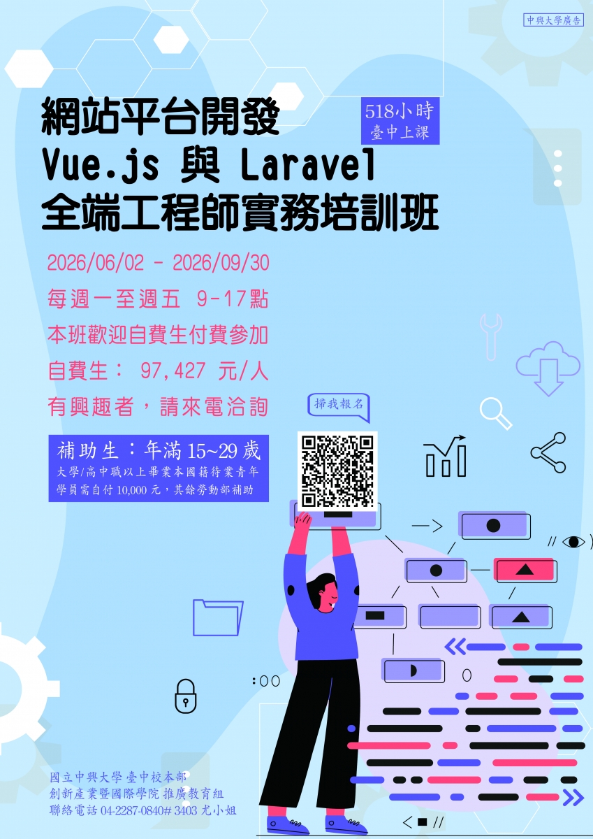 | 網站平台開發-Vue.js 與 Laravel 全端工程師實務培訓班 | 06/02至09/30 | https://pse.is/8k2mrl | 臺中校本部 | 無 |