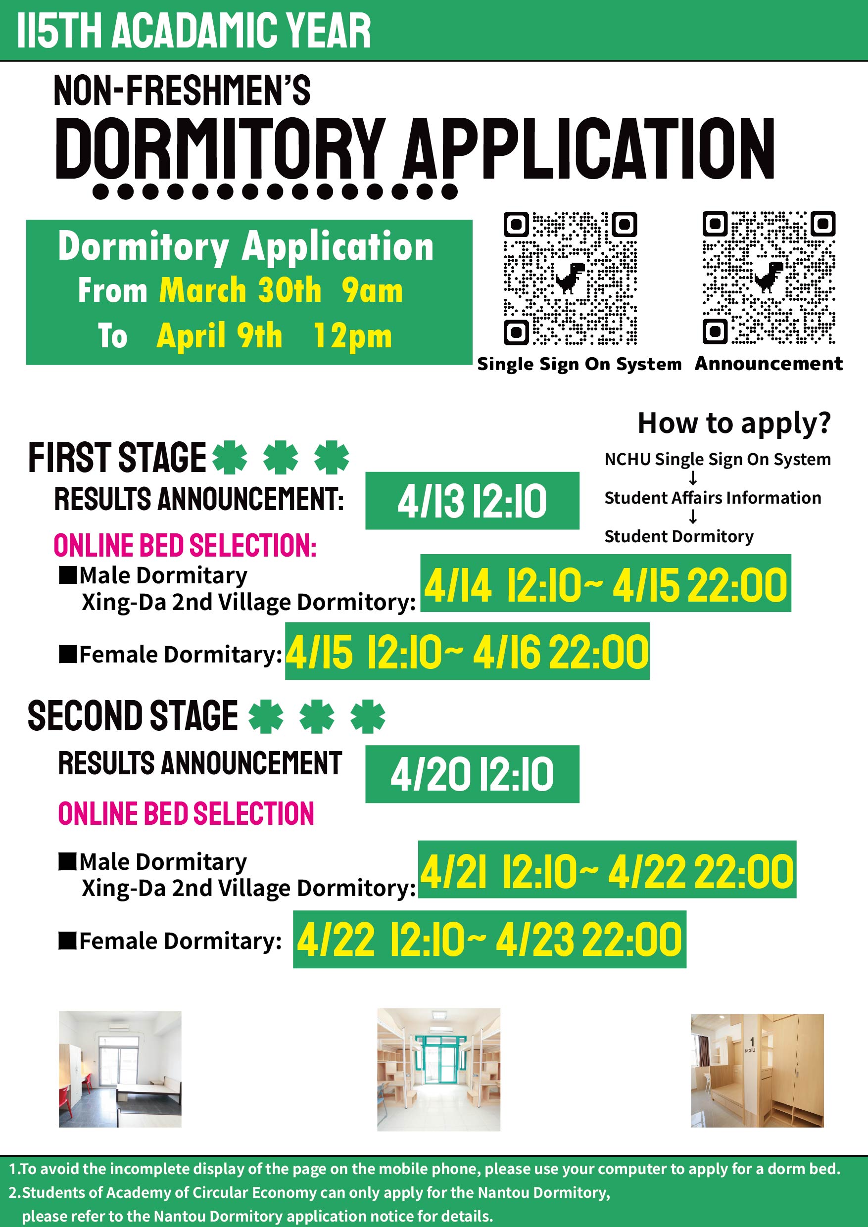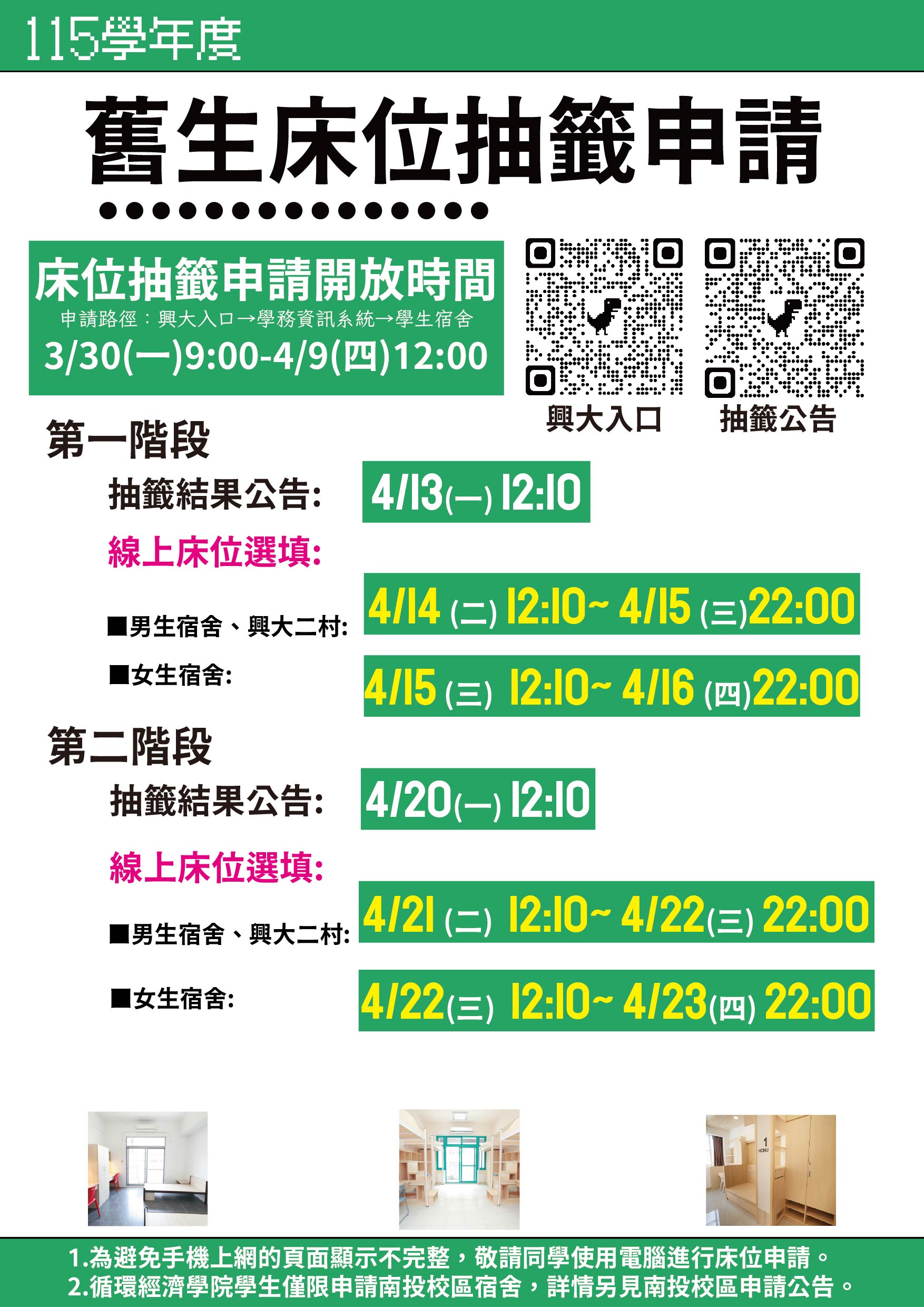 - 相關附件 115學年度舊生(個人)宿舍床位抽籤申請.jpg 、 Announcement of non-freshmen’s dormitory application through computer drawinglots for 115th academic year.jpg