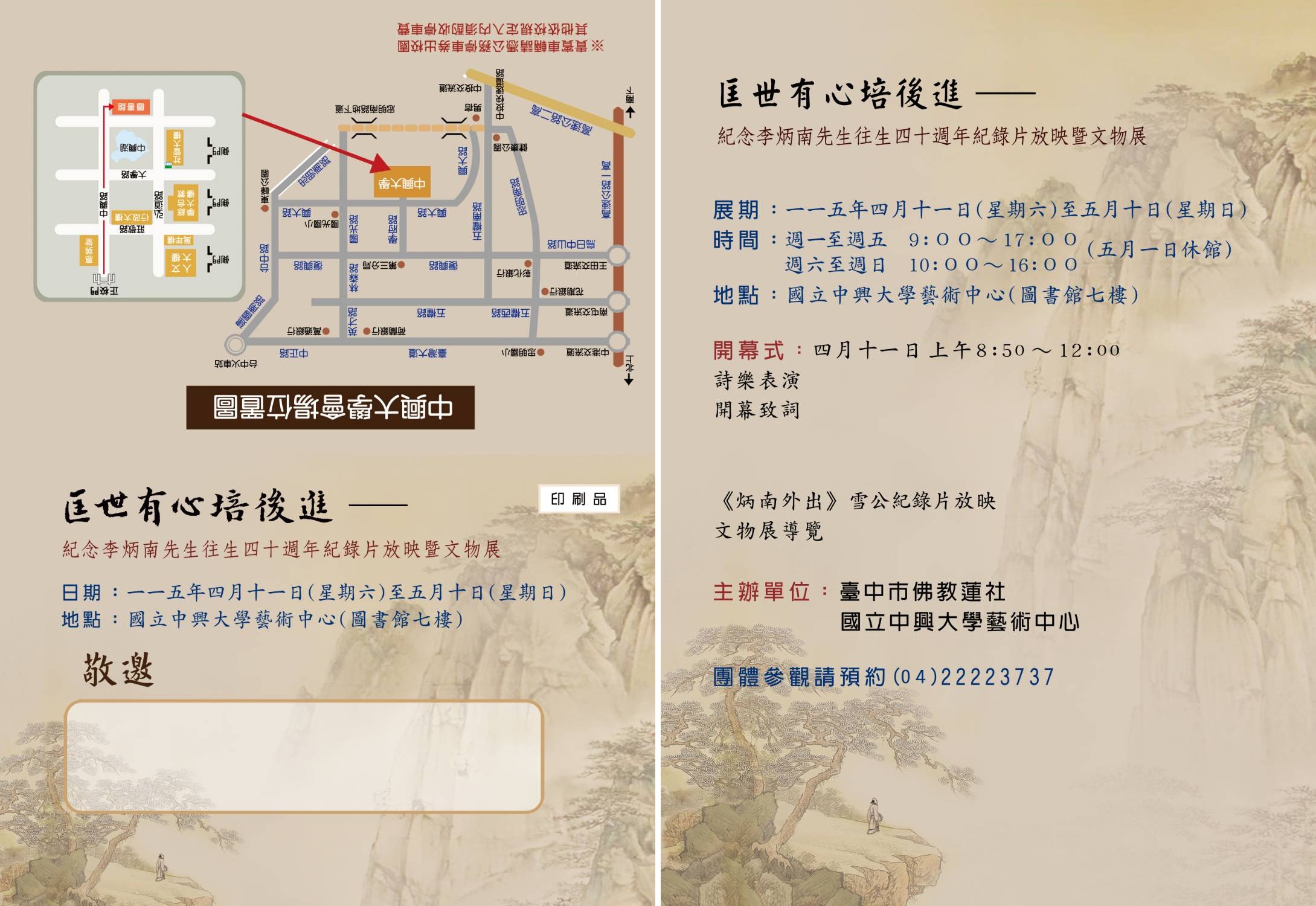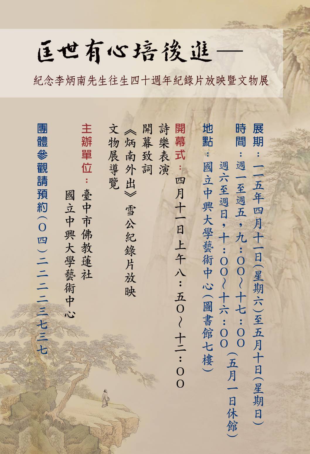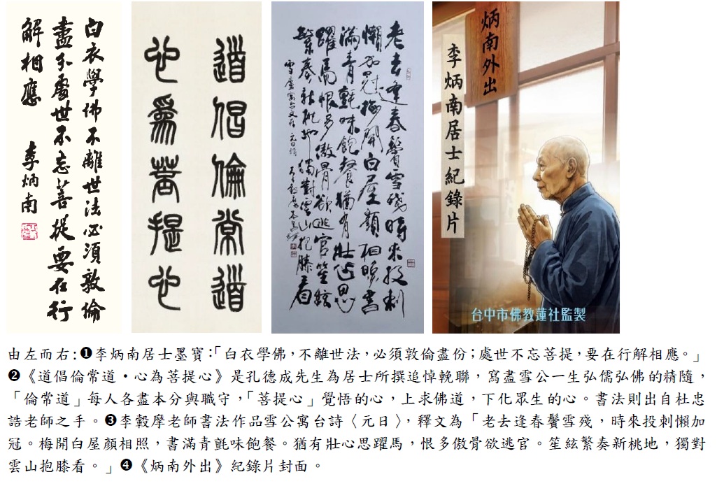 臺中蓮社主辦的《匡世有心培後進―紀念李炳南先生往生四十週年紀錄片放映暨文物展》自115年4月11日(六)至5月10日(日)於國立中興大學藝術中心登場。此次展覽以李炳南居士《雪廬詩集》〈閑居述志〉一詩中「匡世有心培後進」為主題,闡述居士淡泊仕途,清貧度日,心無掛累,一意只想匡正世風,栽培後進的心志抱負。為了讓更多人看見歷久彌新的一代大德風範,這次透過書法展、文物展及紀錄片發表等多元展覽內容,緬懷化育無數儒佛學子,將畢生奉獻於文化社教與慈善志業的李炳南居士,同時表達後輩門生的孺慕之情。