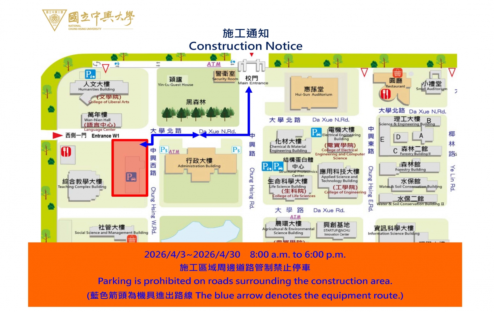 敬請本校師生及來賓配合現場公告,勿於施工區域、周邊停車場及人行道停放汽機(踏)車,並配合現場交通管制,施工期間因部分工項產生噪音,敬請包涵。如遇不可抗拒因素(例如:颱風、大雨等),施工日期將順延。 All faculty, students, and visitors are requested to follow on-site notices, avoid parking in the construction area, nearby parking lots, and sidewalks, and comply with traffic control. Noise may occur during construction; your understanding is appreciated. Work will be rescheduled in case of typhoon or heavy rain. |