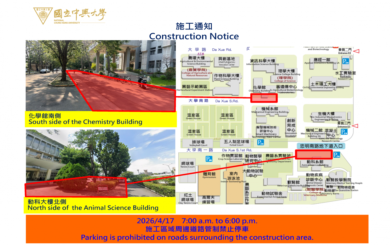 【營繕組施工公告-115年4月17日(五)「化學館及動科大樓電梯吊掛工程」施工道路管制通知】Construction Notice 4/17, 2026