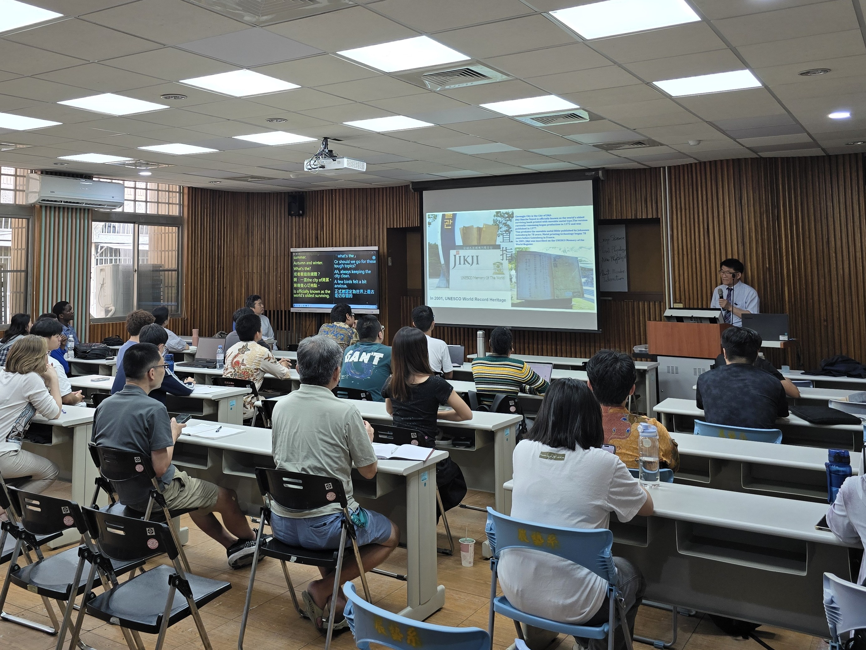 Buckwheat (蕎麥) 對於土壤的要求不高,在非常貧瘠的土壤中也可以生長,而且耐寒性也強,由於蕎麥生長期短,僅90日即可採收,不會影響隔年一期作水稻的插秧期,深受臺灣農民喜愛,也因為短期即可收穫之特性,蕎麥亦被稱作為救荒作物。Soybean (大豆) 則是國內重要的雜糧作物,主要產區為雲林縣、屏東縣及花蓮縣,臺灣研發的大豆品種,營養價值普遍都高於進口大豆。兩位理事長分別就蕎麥及大豆在韓國與日本目前生產的情況,以及因應全球氣候變遷所造成對糧食作物生產的衝擊提出對策。當天過程中討論熱絡,國農所多位外籍生也到場聆聽。