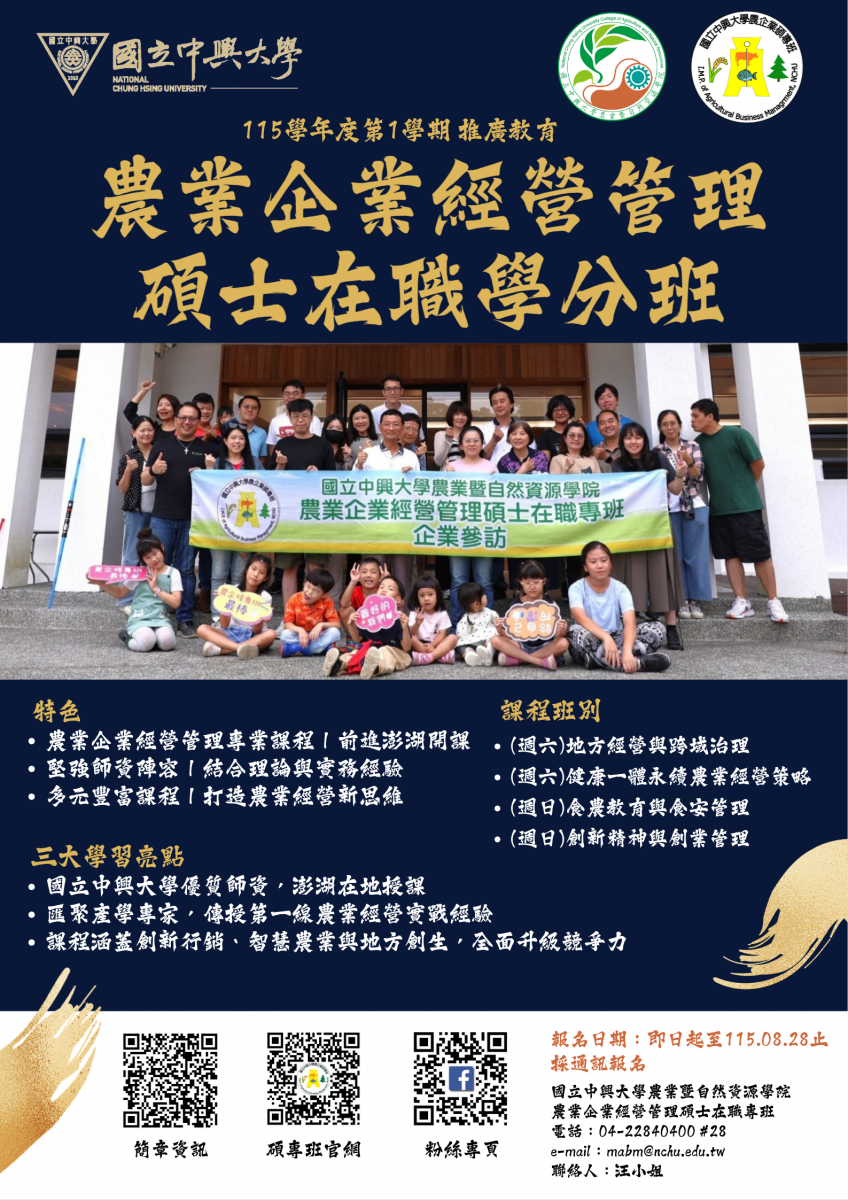 - 相關附件 國立中興大學農業企業經營管理碩士在職學分班(澎湖班)第1期招生簡章+報名表.pdf 、 澎湖學分班招生海報.png